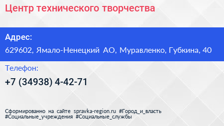 Центр технического творчества по адресу 629602, Ямало-Ненецкий АО, Муравленко, Губкина, 40 в дальнейшем Организация, размещена в следующих категориях: