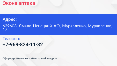 Экона, аптека по адресу 629603, Ямало-Ненецкий АО, Муравленко, Муравленко, 17 в дальнейшем Организация, размещена в следующих категориях: