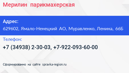 Мерилин+, парикмахерская по адресу 629602, Ямало-Ненецкий АО, Муравленко, Ленина, 66Б в дальнейшем Организация, размещена в следующих категориях: