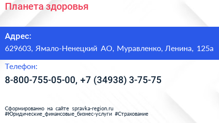 Планета здоровья по адресу 629603, Ямало-Ненецкий АО, Муравленко, Ленина, 125а в дальнейшем Организация, размещена в следующих категориях: