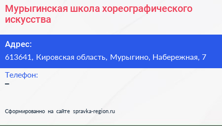 Мурыгинская школа хореографического искусства по адресу 613641, Кировская область, Мурыгино, Набережная, 7 в дальнейшем Организация, размещена в следующих категориях: