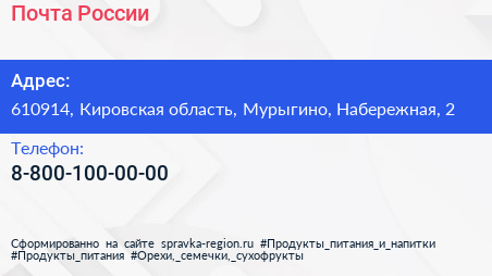 Почта России по адресу 610914, Кировская область, Мурыгино, Набережная, 2 в дальнейшем Организация, размещена в следующих категориях: