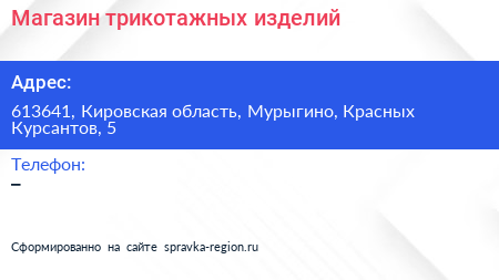 Магазин трикотажных изделий по адресу 613641, Кировская область, Мурыгино, Красных Курсантов, 5 в дальнейшем Организация, размещена в следующих категориях: