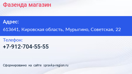 Фазенда, магазин по адресу 613641, Кировская область, Мурыгино, Советская, 22 в дальнейшем Организация, размещена в следующих категориях:
