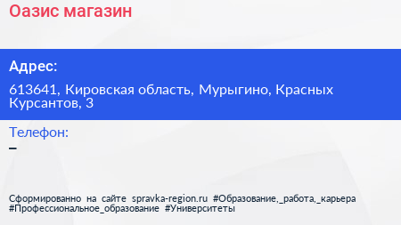Оазис, магазин по адресу 613641, Кировская область, Мурыгино, Красных Курсантов, 3 в дальнейшем Организация, размещена в следующих категориях: