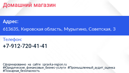 Домашний, магазин по адресу 613635, Кировская область, Мурыгино, Советская, 3 в дальнейшем Организация, размещена в следующих категориях: