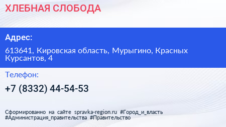 ХЛЕБНАЯ СЛОБОДА по адресу 613641, Кировская область, Мурыгино, Красных Курсантов, 4 в дальнейшем Организация, размещена в следующих категориях: