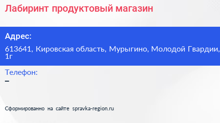 Лабиринт, продуктовый магазин по адресу 613641, Кировская область, Мурыгино, Молодой Гвардии, 1г в дальнейшем Организация, размещена в следующих категориях: