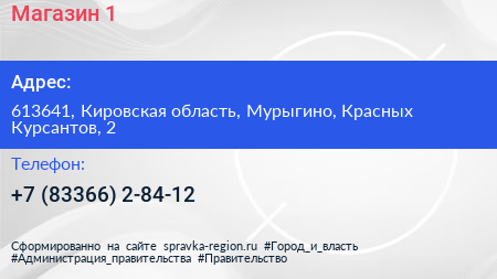 Магазин №1 по адресу 613641, Кировская область, Мурыгино, Красных Курсантов, 2 в дальнейшем Организация, размещена в следующих категориях: