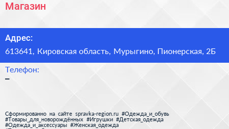 Магазин по адресу 613641, Кировская область, Мурыгино, Пионерская, 2Б в дальнейшем Организация, размещена в следующих категориях: