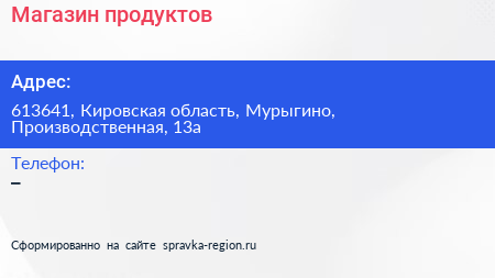 Магазин продуктов по адресу 613641, Кировская область, Мурыгино, Производственная, 13а в дальнейшем Организация, размещена в следующих категориях: