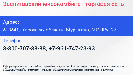 Звениговский мясокомбинат, торговая сеть по адресу 613641, Кировская область, Мурыгино, МОПРа, 27 в дальнейшем Организация, размещена в следующих категориях: