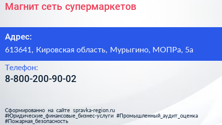 Магнит, сеть супермаркетов по адресу 613641, Кировская область, Мурыгино, МОПРа, 5а в дальнейшем Организация, размещена в следующих категориях: