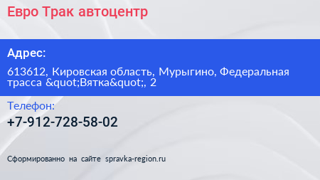 Евро-Трак, автоцентр по адресу 613612, Кировская область, Мурыгино, Федеральная трасса "Вятка", 2 в дальнейшем Организация, размещена в следующих категориях: