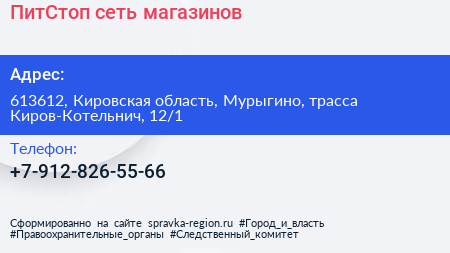 ПитСтоп, сеть магазинов по адресу 613612, Кировская область, Мурыгино, трасса Киров-Котельнич, 12/1 в дальнейшем Организация, размещена в следующих категориях: