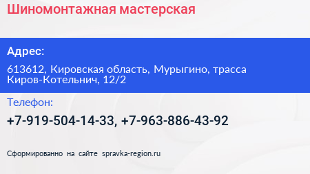 Шиномонтажная мастерская по адресу 613612, Кировская область, Мурыгино, трасса Киров-Котельнич, 12/2 в дальнейшем Организация, размещена в следующих категориях: