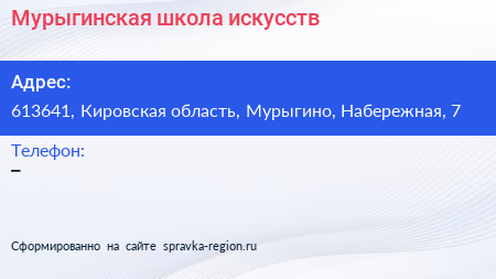 Мурыгинская школа искусств по адресу 613641, Кировская область, Мурыгино, Набережная, 7 в дальнейшем Организация, размещена в следующих категориях: