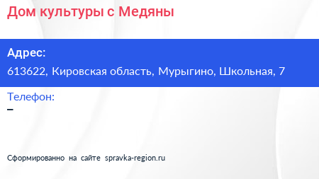 Дом культуры, с. Медяны по адресу 613622, Кировская область, Мурыгино, Школьная, 7 в дальнейшем Организация, размещена в следующих категориях:
