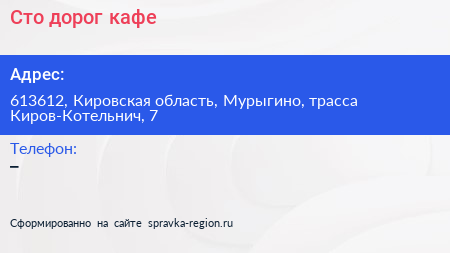 Сто дорог, кафе по адресу 613612, Кировская область, Мурыгино, трасса Киров-Котельнич, 7 в дальнейшем Организация, размещена в следующих категориях: