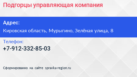 Подгорцы, управляющая компания по адресу Кировская область, Мурыгино, Зелёная улица, 8 в дальнейшем Организация, размещена в следующих категориях: