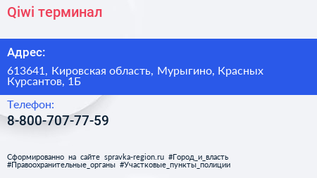 Qiwi, терминал по адресу 613641, Кировская область, Мурыгино, Красных Курсантов, 1Б в дальнейшем Организация, размещена в следующих категориях: