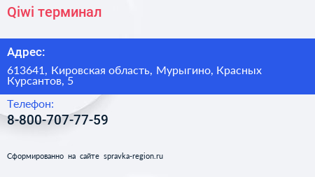 Qiwi, терминал по адресу 613641, Кировская область, Мурыгино, Красных Курсантов, 5 в дальнейшем Организация, размещена в следующих категориях: