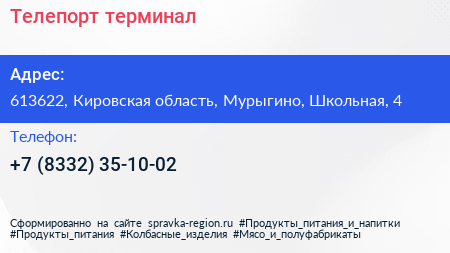 Телепорт, терминал по адресу 613622, Кировская область, Мурыгино, Школьная, 4 в дальнейшем Организация, размещена в следующих категориях: