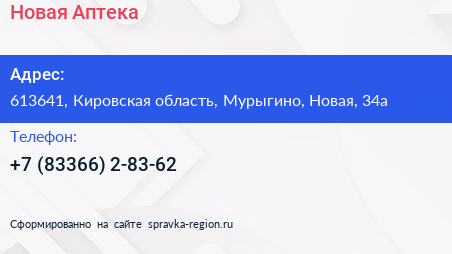 Новая Аптека по адресу 613641, Кировская область, Мурыгино, Новая, 34а в дальнейшем Организация, размещена в следующих категориях: