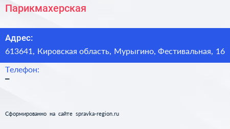 Парикмахерская по адресу 613641, Кировская область, Мурыгино, Фестивальная, 16 в дальнейшем Организация, размещена в следующих категориях:
