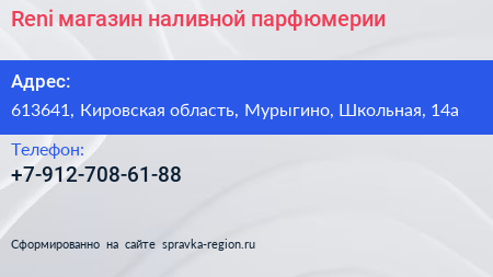 Reni, магазин наливной парфюмерии по адресу 613641, Кировская область, Мурыгино, Школьная, 14а в дальнейшем Организация, размещена в следующих категориях: