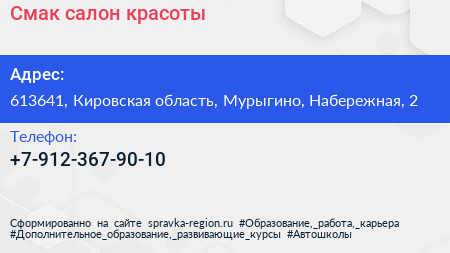 Смак, салон красоты по адресу 613641, Кировская область, Мурыгино, Набережная, 2 в дальнейшем Организация, размещена в следующих категориях: