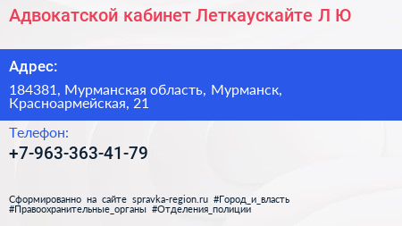 Адвокатской кабинет Леткаускайте Л.Ю. по адресу 184381, Мурманская область, Мурманск, Красноармейская, 21 в дальнейшем Организация, размещена в следующих категориях: