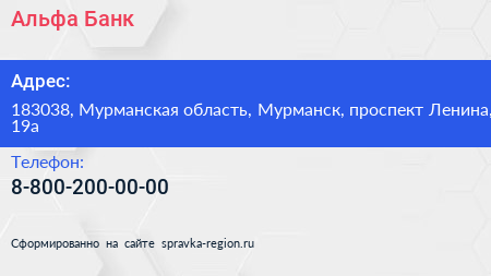 Альфа-Банк по адресу 183038, Мурманская область, Мурманск, проспект Ленина, 19а в дальнейшем Организация, размещена в следующих категориях: