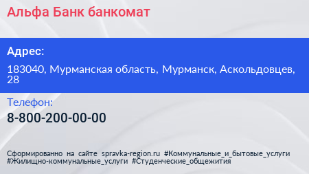 Альфа-Банк, банкомат по адресу 183040, Мурманская область, Мурманск, Аскольдовцев, 28 в дальнейшем Организация, размещена в следующих категориях: