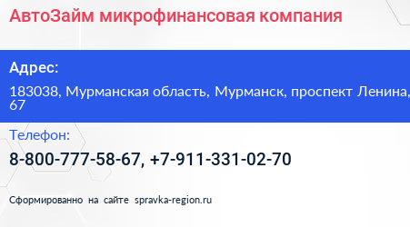 АвтоЗайм, микрофинансовая компания по адресу 183038, Мурманская область, Мурманск, проспект Ленина, 67 в дальнейшем Организация, размещена в следующих категориях:
