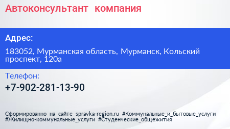 Автоконсультант+, компания по адресу 183052, Мурманская область, Мурманск, Кольский проспект, 120а в дальнейшем Организация, размещена в следующих категориях: