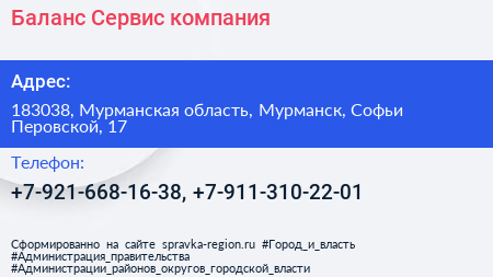 Баланс-Сервис, компания по адресу 183038, Мурманская область, Мурманск, Софьи Перовской, 17 в дальнейшем Организация, размещена в следующих категориях:
