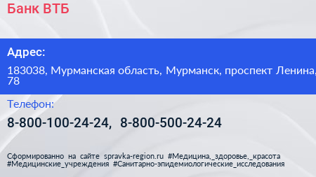 Банк ВТБ по адресу 183038, Мурманская область, Мурманск, проспект Ленина, 78 в дальнейшем Организация, размещена в следующих категориях: