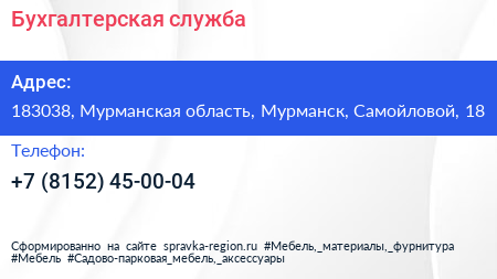 Бухгалтерская служба по адресу 183038, Мурманская область, Мурманск, Самойловой, 18 в дальнейшем Организация, размещена в следующих категориях: