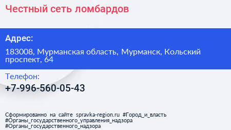 Честный, сеть ломбардов по адресу 183008, Мурманская область, Мурманск, Кольский проспект, 64 в дальнейшем Организация, размещена в следующих категориях: