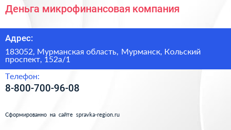 Деньга, микрофинансовая компания по адресу 183052, Мурманская область, Мурманск, Кольский проспект, 152а/1 в дальнейшем Организация, размещена в следующих категориях: