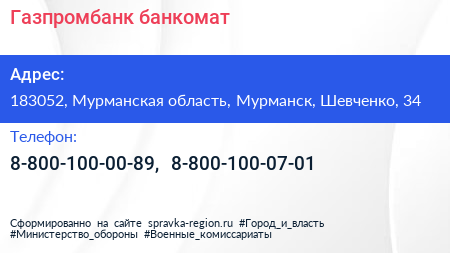 Газпромбанк, банкомат по адресу 183052, Мурманская область, Мурманск, Шевченко, 34 в дальнейшем Организация, размещена в следующих категориях: