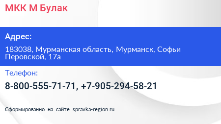 МКК М Булак по адресу 183038, Мурманская область, Мурманск, Софьи Перовской, 17а в дальнейшем Организация, размещена в следующих категориях: