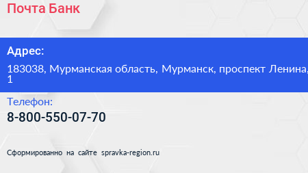 Почта Банк по адресу 183038, Мурманская область, Мурманск, проспект Ленина, 1 в дальнейшем Организация, размещена в следующих категориях: