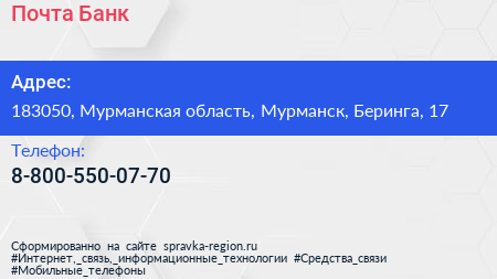 Почта Банк по адресу 183050, Мурманская область, Мурманск, Беринга, 17 в дальнейшем Организация, размещена в следующих категориях:
