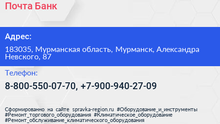 Почта Банк по адресу 183035, Мурманская область, Мурманск, Александра Невского, 87 в дальнейшем Организация, размещена в следующих категориях: