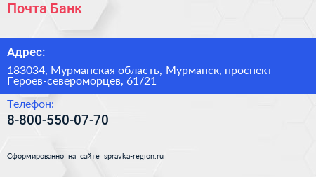 Почта Банк по адресу 183034, Мурманская область, Мурманск, проспект Героев-североморцев, 61/21 в дальнейшем Организация, размещена в следующих категориях: