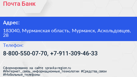 Почта Банк по адресу 183040, Мурманская область, Мурманск, Аскольдовцев, 28 в дальнейшем Организация, размещена в следующих категориях: