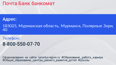 Почта Банк, банкомат по адресу 183025, Мурманская область, Мурманск, Полярные Зори, 40 в дальнейшем Организация, размещена в следующих категориях: