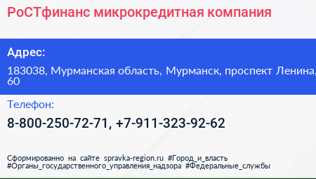 РоСТфинанс, микрокредитная компания по адресу 183038, Мурманская область, Мурманск, проспект Ленина, 60 в дальнейшем Организация, размещена в следующих категориях: